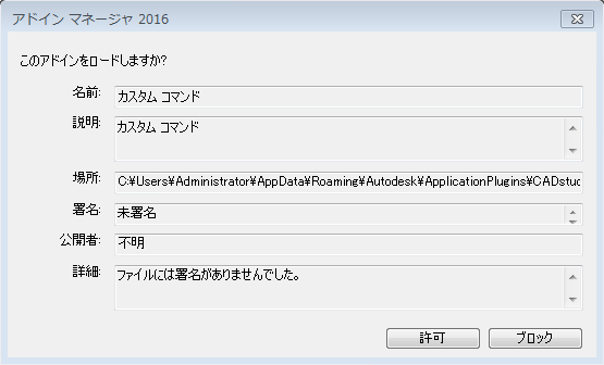 オートデスク以外の製品のアドインがロードされている場合、新しいダイアログ ボックスが表示され、アドインのロードを許可するかブロックするかを選択できるようになりました。この設定は、以降のセッションにも保持されます。アドイン マネージャを使用して、許可とブロックの設定を確認して変更することができます。