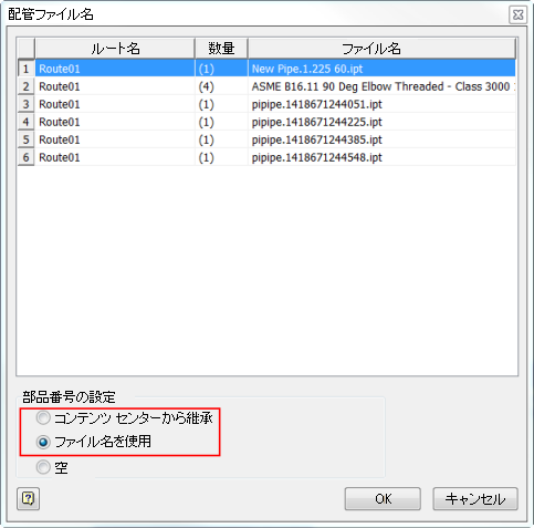 [部品番号の設定を有効にする]: 図面環境で、パーツ一覧に部品番号を入力できます。部品番号がパーツ ファイル内で更新され、パーツ一覧に表示されます。このオプションを選択すると、[配管ファイル名]ダイアログ ボックスの[部品番号の設定]オプションも使用できるようになります。