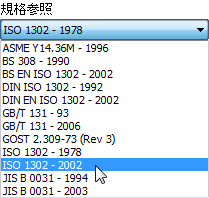 面の指示記号スタイルが更新され、さまざまな製図規格に対応する記号形式を利用できるようになりました。面の指示記号スタイルを定義する際は、[スタイルおよび規格エディタ]の[規格参照]一覧から目的の規格を選択します。