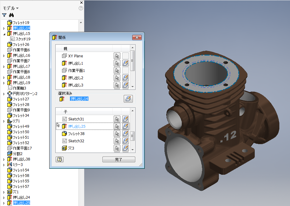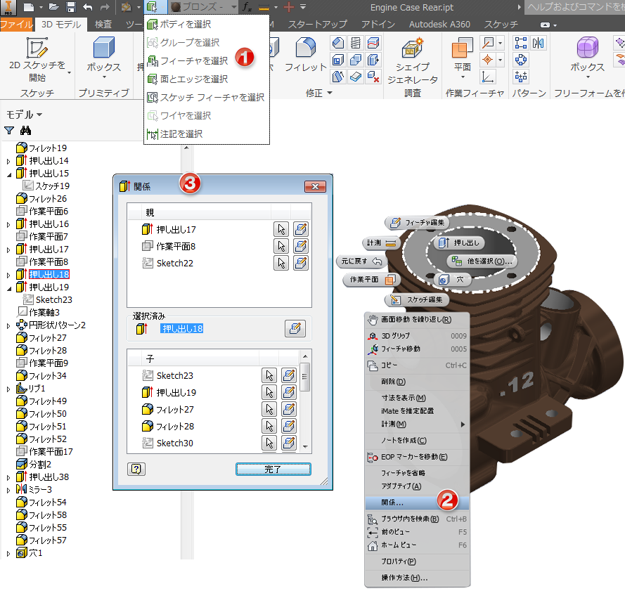 パーツ環境では、モデル ブラウザまたはグラフィックス ウィンドウを利用してパーツから簡単に親/子フィーチャ関係にアクセスできるようになりました。この新しいインタラクティブなダイアログ ボックスにより、パーツ内から直接フィーチャの依存関係を表示することができます。[関係]ダイアログ ボックスで、[選択]ビューに切り替えるには、