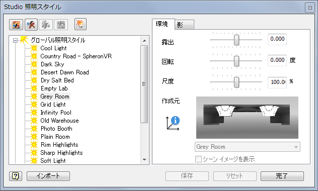 Inventor Studio のすべての照明スタイルが IBL に関連付けられました。IBL は、優れた光源を提供します。