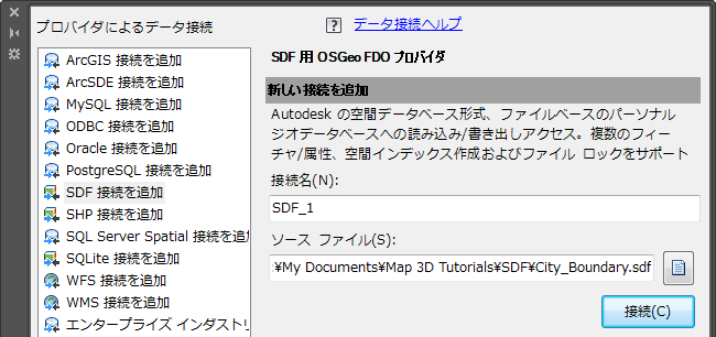 - [ソース ファイル](右側)で参照ボタンをクリックして、サンプルの City_Boundary.sdf ファイルにナビゲートします。[接続]をクリックします。