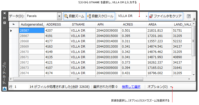 いずれかの画層の[データ テーブル]を表示します。[データ テーブル]をフィルタして、区画のサブセットを表示します。ここでは Villa Drive の区画のみが表示されます。