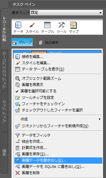 - [表示マネージャ]で[Parcels]画層を右クリックし、[画層データを書き出す]をクリックします。
