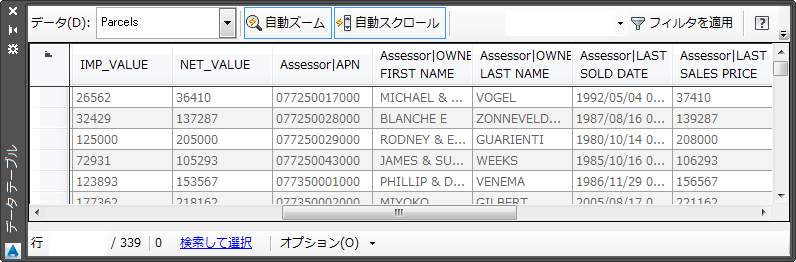 Parcels 画層には、結合データが表示されますが、[データ テーブル]内の結合データはグレー表示になっています。グレーのテキストは、結合データが元のデータ ストアの一部ではないということを表しています。データは計算されたプロパティ内で編集したり使用することはできません。