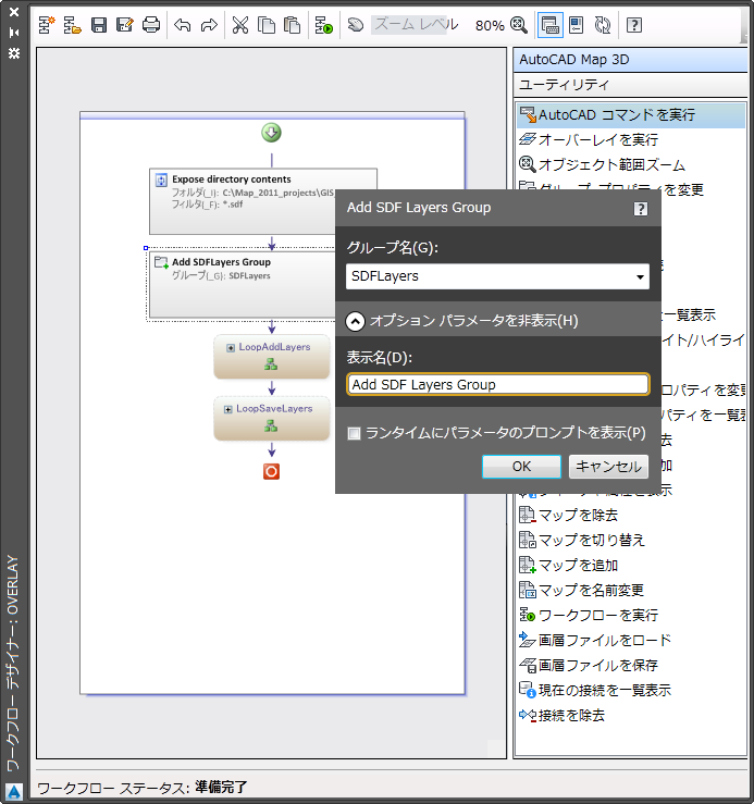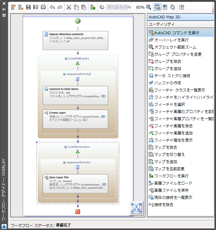 この場合、ForEach アクティビティの名前は "LoopAddLayers"となり、アクティビティの実行内容を示す名前になります。このアクティビティは、[フォルダの内容を検索]アクティビティで指定されたフォルダ内の各 SDF ファイルを調べます。アクティビティは反復実行されるごとに、SDF ファイルに接続して、フィーチャ画層を [表示マネージャ]に追加します。