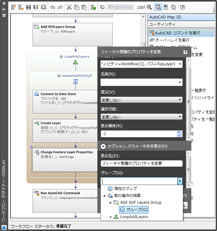 [フィーチャ画層のプロパティを変更]アクティビティを[LoopAddLayers]アクティビティ内にドラッグし、[画層を作成]の直後に配置します。パラメータを変更し、変更する画層および画層のグループを指定します。
