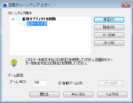 図面クリーンアップが図面内のエラーを探し、[図面クリーンアップ エラー]ダイアログ ボックスを表示します。このダイアログ ボックスは、エラーをエラー タイプで分類します。[重複オブジェクトを削除]がハイライト表示されています。