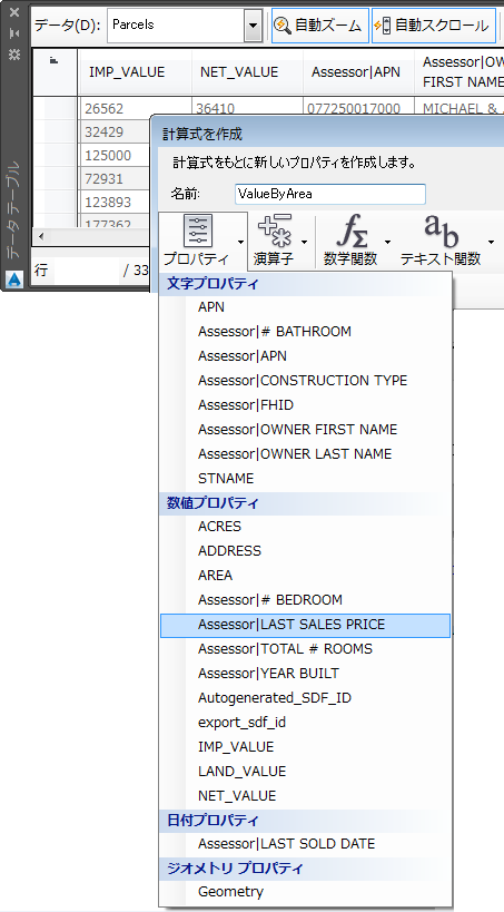 ここまでの演習で、所有者データを Parcels 画層に結合して、結果を新しいデータ ストアに保存しました。組み合わされた情報を使用して、計算したプロパティを作成することができます。計算したプロパティは式の結果になります。この場合は、最新の販売価格を面積で除算した値になります。