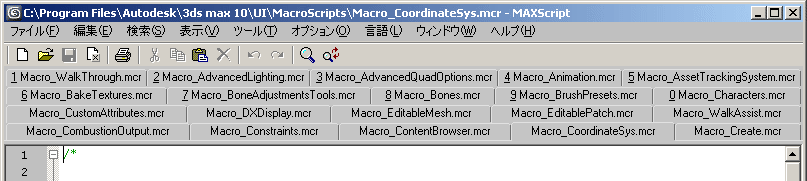 3ds Max 2008 で導入された MAXScript タブ付きエディタ ウィンドウ は、3ds Max ルート フォルダにある MXS_Editor.properties および MAXScript.properties ファイルを編集することで、カスタマイズできます。