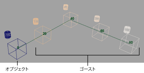 次の例では、立方体のゴースト化のタイプ(Type of Ghosting)がカスタム フレーム(Custom Frames)です。立方体のゴースト オプションは、表示するフレーム(Frames to Display)フィールドにフレーム番号 20、40、60、80 が存在し、階層(Hierarchy)はオンです。円柱は立方体の子になっています。