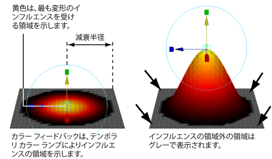 カラー フィードバック(Color Feedback)を使用すると、インフルエンスの領域が視覚的に示されるほか、作用領域内のインフルエンスと減衰の量もわかります。減衰カーブ(Falloff Curve)に基づいて、最も大きなインフルエンスを受ける領域は黄色で表示されます。カラー ランプは、デフォーマのインフルエンスが減少するにつれ、濃いオレンジと赤がブレンドされます。インフルエンスの領域内に含まれる領域で、変形されていない領域は黒で表示されます。減衰半径(Falloff Radius)外の領域はグレーで表示されます。