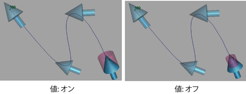 - 入力接続(In connections)がオフの場合に、円柱は矢印の初期値をコピーしますが、移動がカーブからの入力に応じて異なるためにアニメートされません。