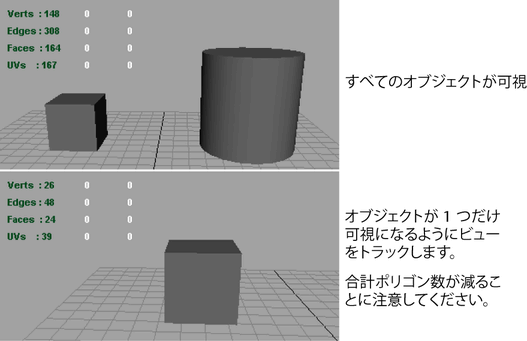ポリゴン数の表示では、(選択の有無に関わらず)可視オブジェクトが数えられるだけです。ビューをトラックしていくつかのオブジェクトが可視にされなくなると、それらのオブジェクトはポリゴン数には含まれなくなります。