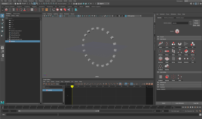 MASH ワークスペースに切り替えるには、ウィンドウ > ワークスペース > MASH(Windows > Workspaces > MASH)に移動するか、インタフェースの右上隅のあるワークスペース(Workspace)ドロップダウンから MASH を選択します。