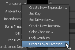 - オーバーライドを作成するアトリビュート(たとえば、透明度(Transparency))を右クリックして、表示されるメニューからレイヤ オーバーライドの作成(Create Layer Override)を選択します。
