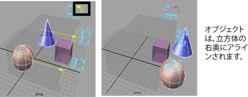 次の例では、オブジェクトが立方体の右奥、透明なボックスの外側に位置合わせされます。