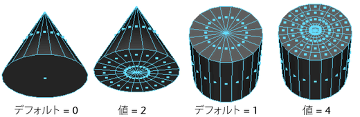キャップとは、円錐、円柱、プリズム、ピラミッド、パイプ、およびらせんの上部、下部、または側部のことです。このオプションでは、プリミティブのキャップの原点の周りに分割の数を定義します。このオプションは、チャネル ボックス(Channel Box)およびアトリビュート エディタ(Attribute Editor)でキャップの分割数(Subdivisions Cap)と呼ばれます。この値を増減して、キャップの周りでフェースを追加、あるいはそこから取り除きます。