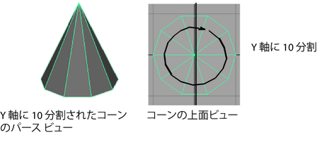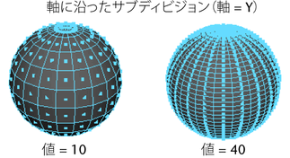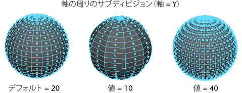 このオプションでは、軸の周りに存在する分割の数を定義します。このオプションは、チャネル ボックス(Channel Box)およびアトリビュート エディタ(Attribute Editor)で軸の分割数(Subdivisions Axis)と呼ばれます。