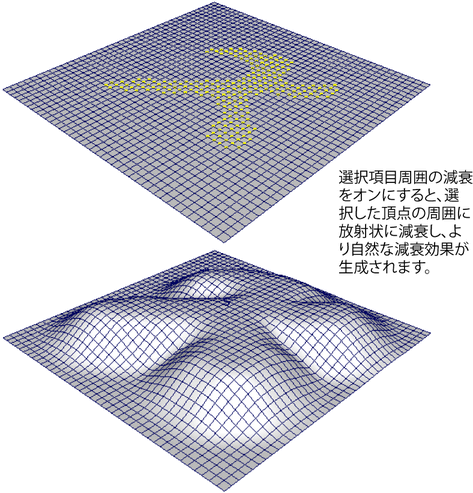 - 選択した各頂点の周囲に放射状に減衰します。このため、より自然な減衰効果が生成されます。特に、選択した頂点が任意のシェイプを形成した場合に有効なオプションです。
