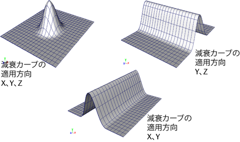 - 変形減衰カーブが適用される X、Y、Z 軸に沿った方向。1 つ以上の方向に沿って減衰をオフにすると、さまざまなエフェクトを作成できます(ランプ、エッジなど)。