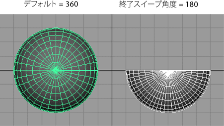 このオプションを使用すると、回転角度を指定することによって、部分的な球を作成することができます。角度の値は、0 ~ 360° の範囲をとることができます。次の例には、終了スイープ角度(End Sweep Angle)が 180°の、球の上面ビューが示されています。