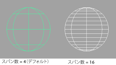 球上の 1 方向に作成されるサーフェス カーブの数を設定します。サーフェス カーブは、アイソパラムとも呼ばれ、サーフェスのシェイプのアウトラインを表します。サーフェスにセクション(およびスパン)が多く含まれるほど、サーフェスの変形が精度よく示されます。