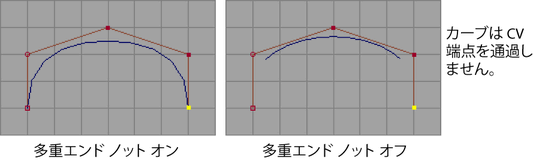オンにすると、このカーブのエディット ポイント端点(ノット)が CV 端点上に重なります。一般に、これによってカーブの端点領域がコントロールし易くなります。