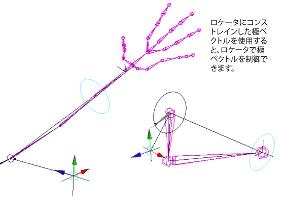 一般に、IK 回転プレーン ハンドルを操作するときにジョイント チェーンが不意に反転しないように極ベクトルをコンストレイントします。反転はハンドル ベクトルが極ベクトルに接近または交差するときに起きることがあるため、極ベクトルをコンストレイントしてハンドル ベクトルが交差しないようにします。