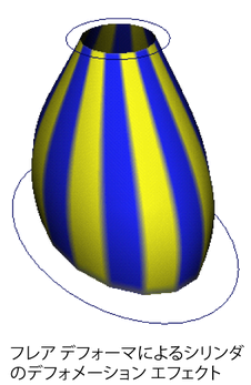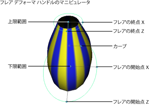 フレア デフォーマを使用すると、どんな変形可能オブジェクトでも 2 つの軸に沿って広げたり(フレア)、狭めたり(テーパー)することができます。これは、キャラクタのセットアップとモデリングの際に便利です。フレア デフォーマでは、ハンドルを操作して、広げたり狭めたりするエフェクトの適用範囲と程度を直感的に制御することができます。
