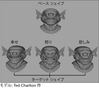 このツールを使って、頂点ごとにブレンド シェイプ ウェイトを設定できます。つまり、ベース シェイプ上にターゲット シェイプが与えるインフルエンスの程度を、よりきめ細かくコントロールできます。また、このツールにより、ターゲット シェイプごとにウェイトをペイントすることも、ターゲット シェイプをミックスしたり、部分的なターゲットを作成することもできます。