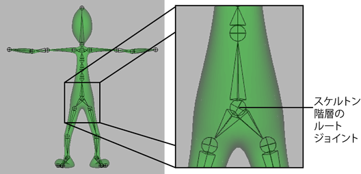 ルート ジョイントとは、スケルトンの階層構造の最上位に位置するジョイントです。1 つのスケルトンには、ルート ジョイントが 1 つだけ存在します。ルート ジョイントを移動し回転することによって、ワールド空間のスケルトン全体を移動し方向付けることができます。