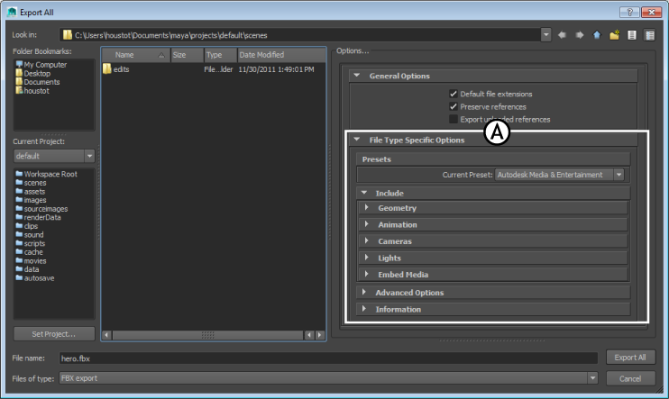 Maya のすべて書き出し(Export All)ダイアログ ボックス A. FBX 書き出し オプション