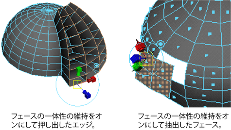 フェースの押し出し、抽出、複製を行う場合、フェースの一体性の維持(Keep Faces Together)をオンまたはオフにして、個々のフェースのエッジを維持するか、選択範囲の境界エッジに沿ったエッジだけを維持するかを指定することができます。