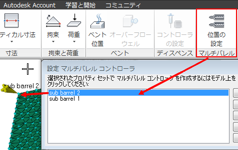 [ホーム]タブでマスター バレルの射出位置を設定し、[境界条件]タブでサブバレルの位置を設定します。