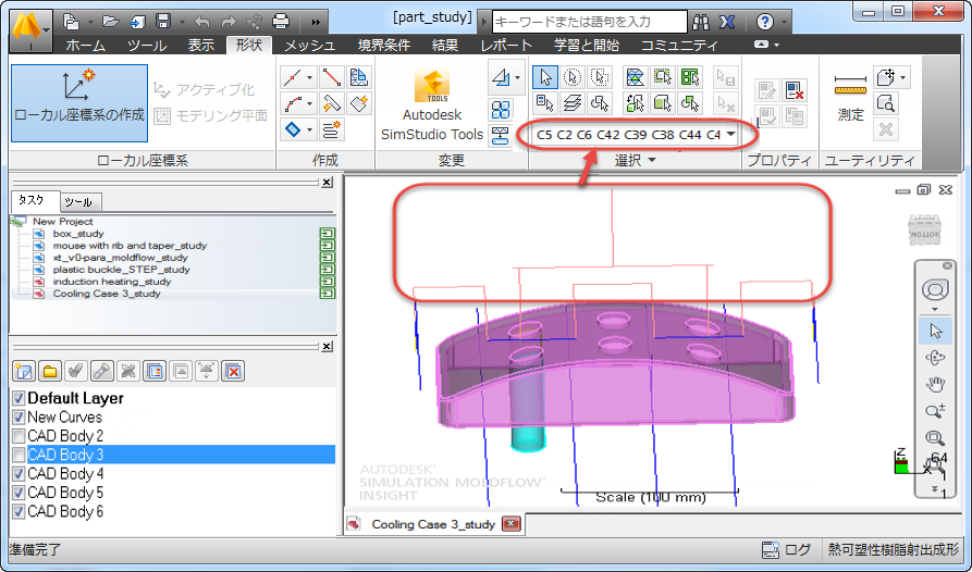 カーブには識別ラベル「C」が割り当てられます。すべてのカーブには、文字 C と後に続く数字で構成される一意の識別子があります。カーブを選択すると、識別子が選択リストに一覧表示されます。
