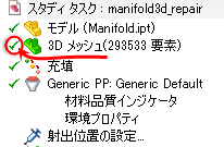 3D メッシュ xxxx 要素が選択されていない場合は、[肉厚方向の改良不足]があることを意味します。スタディ ツリーで[3D メッシュ xxxx 要素]をダブル クリックして、細分化の問題がどこにあるかを確認します。必要に応じて[再メッシュ]して、問題を解決します。