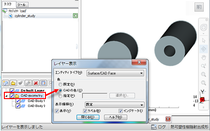 このリリースでは、CAD モデルのコンポーネントを、その CAD プログラムで作成されたときのモデルと同じ色でインポートすることができるようになりました。ホット ランナーと冷却管は、Moldflow既定色を使用してインポートされます。レイヤーに複数の CAD モデルが含まれている場合は、1 つ目の CAD モデルの CAD の色がレイヤー内のすべての CAD モデルに使用されます。