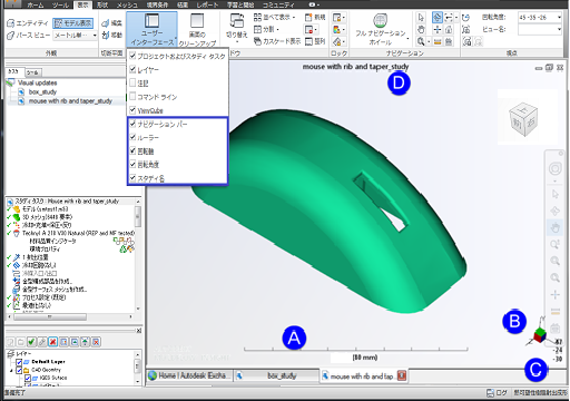 モデル ペインの表示領域をできるだけ広くしてモデルの詳細をよりはっきり表示させたい場合は、[表示]タブを使ってさまざまなユーザ インタフェース項目の表示/非表示を切り替えることができます。