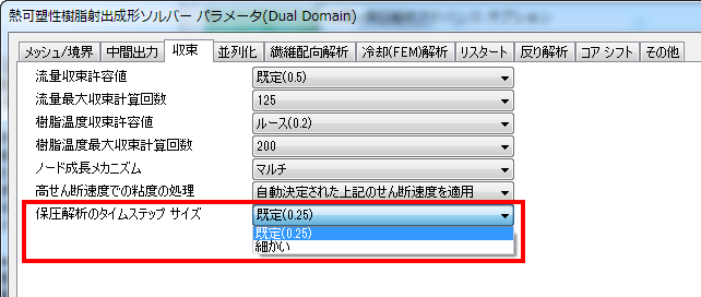 旧リリースの Midplane および Dual Domain フロー ソルバーでは、保圧解析中のタイム ステップ サイズは 0.25 秒に固定されていました。薄い成形品や熱伝導性の高い材料などの特定のケースでは、このタイム ステップ サイズが大きすぎて不正確な結果を招くことが分かりました。たとえば、体積収縮結果のバンディングで最も顕著です。そのため、[ソルバー パラメータ]ダイアログ ボックスの[収束]タブに、保圧タイム ステップ制御用の新しいオプションが追加されました。