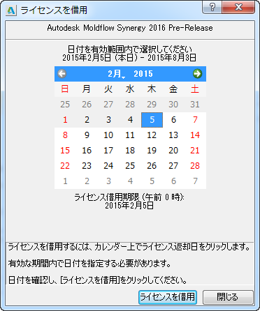 - [ライセンスを借用] ウィンドウのカレンダーで、ライセンスを返却する日付をクリックします。