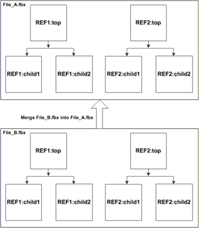 You can merge the FBX files that contain referenced objects in two ways: merge append and merge replace. For example, consider that File_B.fbx is being merged into File_A.fbx as shown in the following figure.