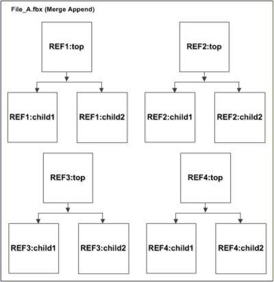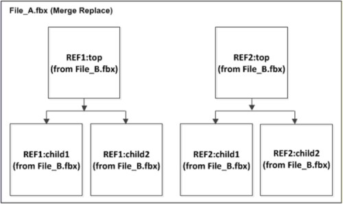 The results of a merge replace are shown in the following figure. The REF1 and REF2 from File_B.fbx replace the REF1 and REF2 in File_A.fbx. The reference edits from File_B.fbx is also merged.