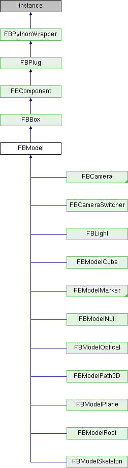 In the MotionBuilder UI, a model can be any object in a scene, created using geometry. Models can represent simple objects like cubes, or complex objects like characters. FBModel is a base class which is not used so much directly, but is the parent of well-used classes like FBCamera, FBLight, and FBModelMarker. It also implements a number of widely-implemented functions and attributes, such as: