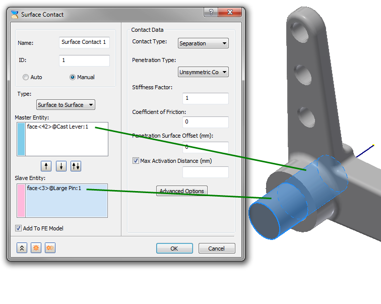 - In general, when selecting the Manual option to setup contact, choose the master as the contact segment that has the least amount of curvature, or if it is cylindrical contact choose the master as the outside segment (and use unsymmetrical penetration).
