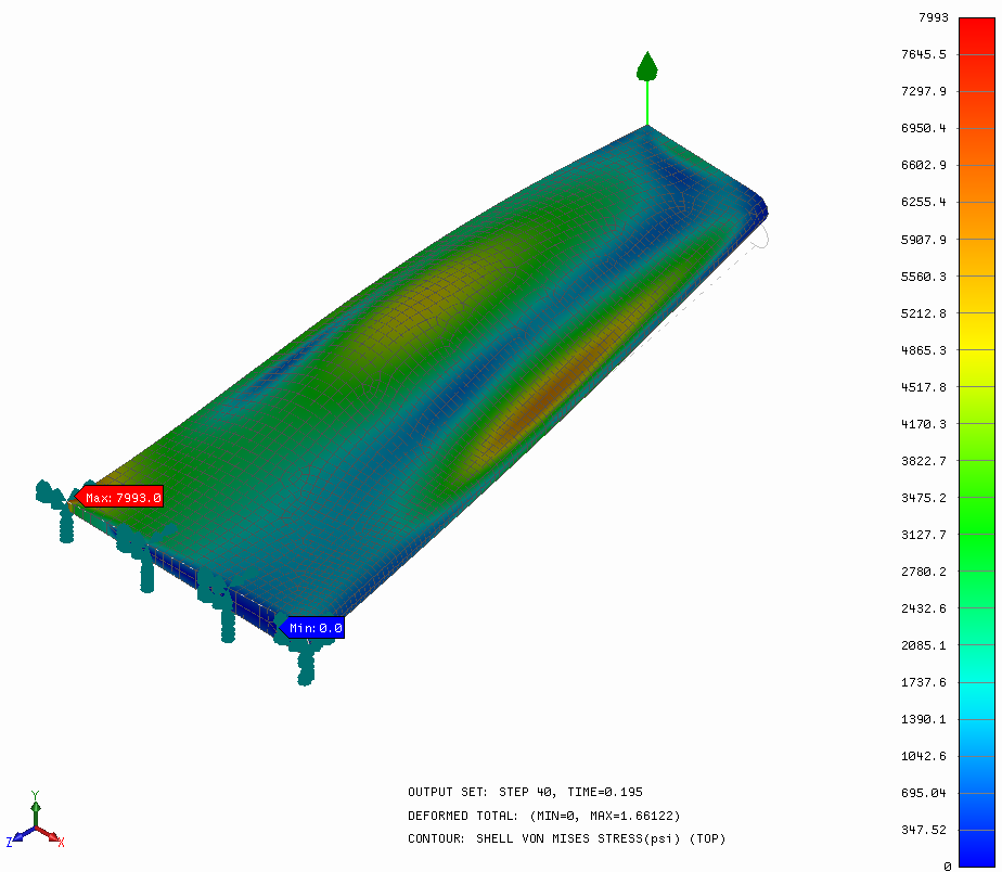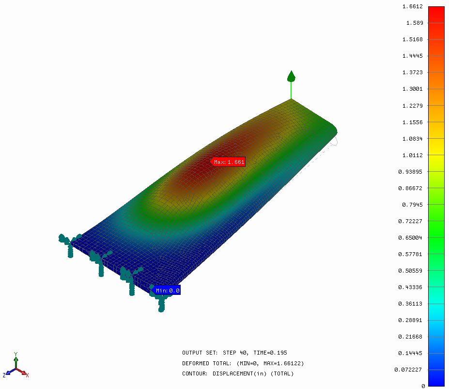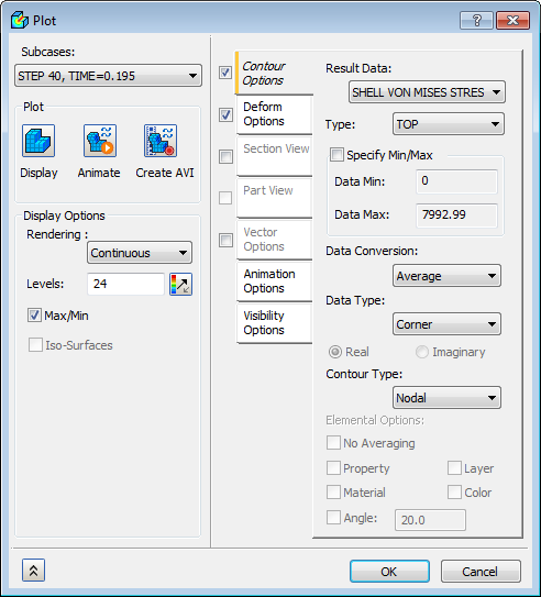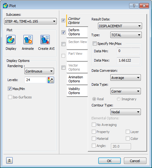 - [サブケース]リストで[ステップ 40、時間=0.195]を選択し、[変位オプション]と[コンター オプション]が選択されていることを確認します。
