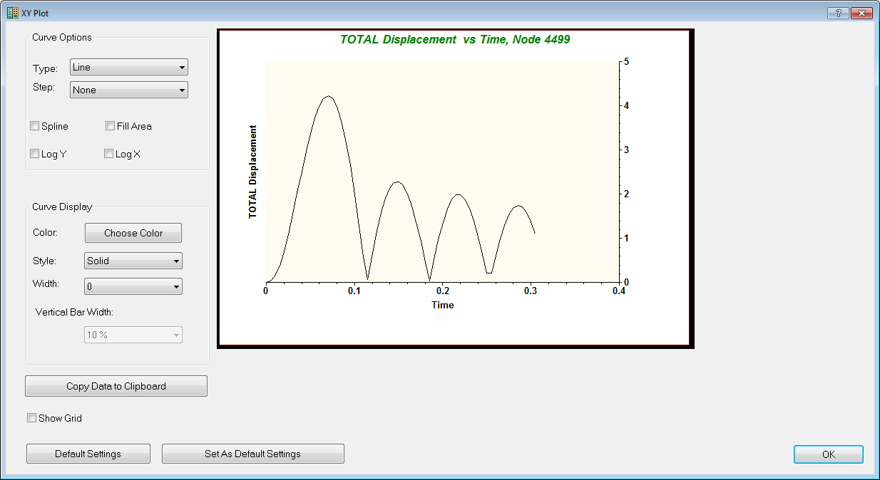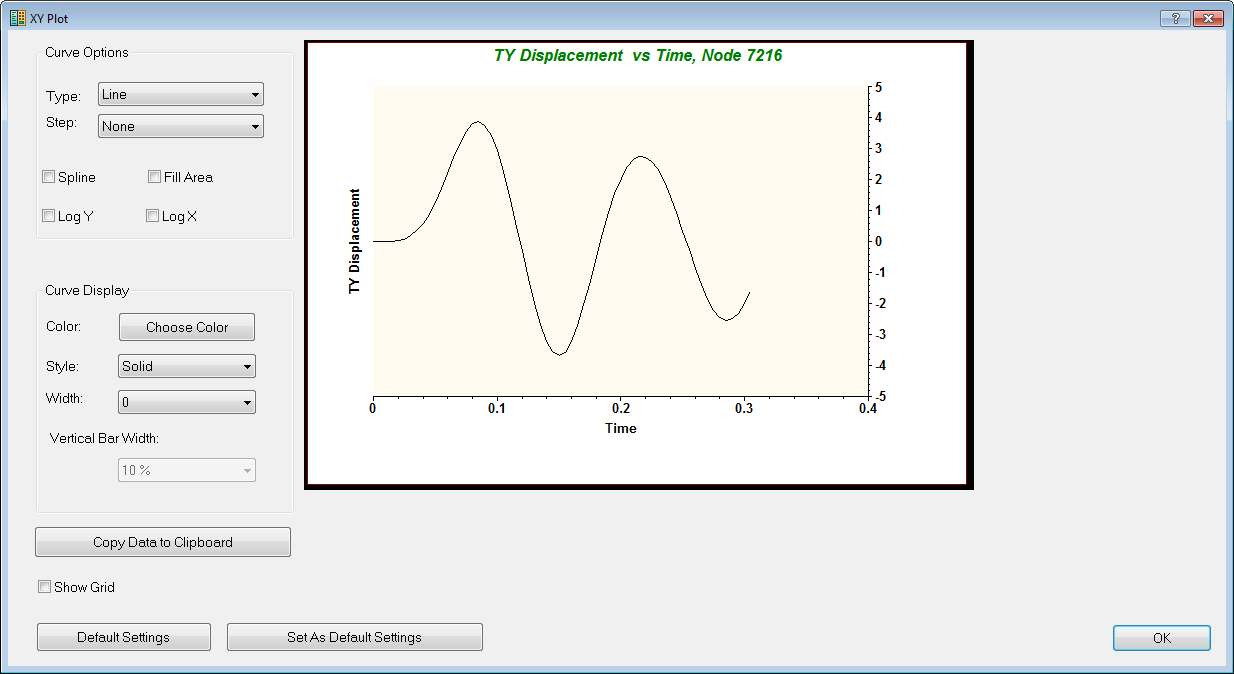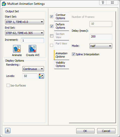 - [終了セット]に[ステップ 62、時間=0.305]を設定します。[変位オプション]チェックボックスのみをオンにして、その他のオプションをすべてオフにします。