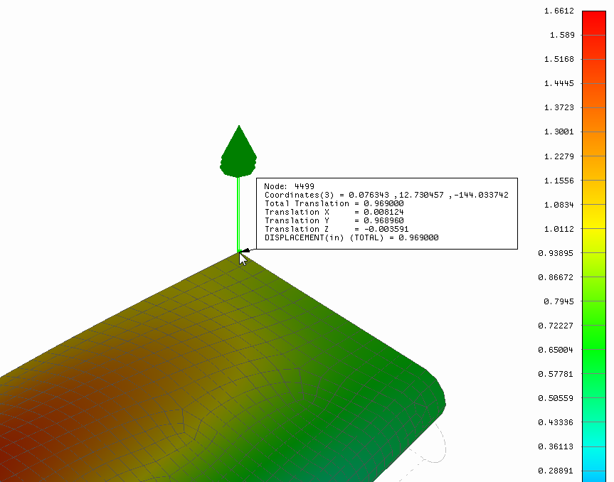 - マウスを移動して、荷重のある節点をハイライト表示します。後で特定の節点における変位の[XY プロット]を作成するために使用できるように、[節点 ID]を書き留めておきます。