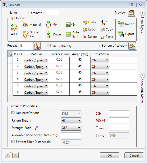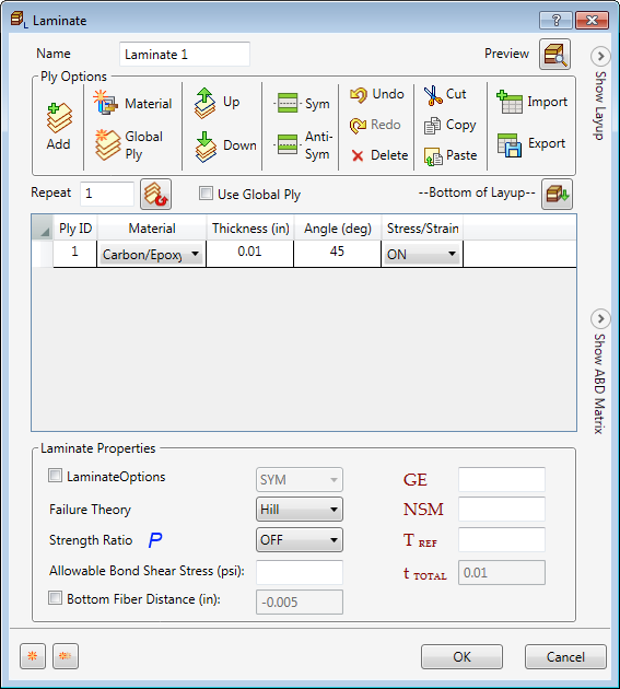- [材料]下にある最初のセル内をクリックして、[材料]下で[カーボン/エポキシ複合材料]を選択します。[厚さ]を「0.01」に設定します(セルを編集するには、既定の厚さをダブルクリックします)。[角度]を「45」に設定します。[応力/ひずみ]出力を[オン]のままにしておきます。