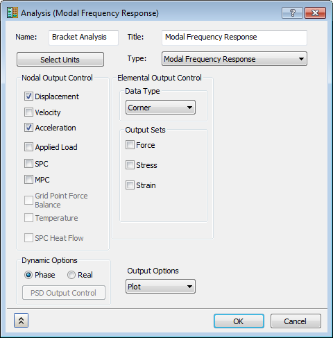 - [節点の出力コントロール]および[要素の出力コントロール]が、次の図に示すように設定されていることを確認します。また、[変位]と[加速度]をオンにする一方で、[応力]をオフにする必要があります。